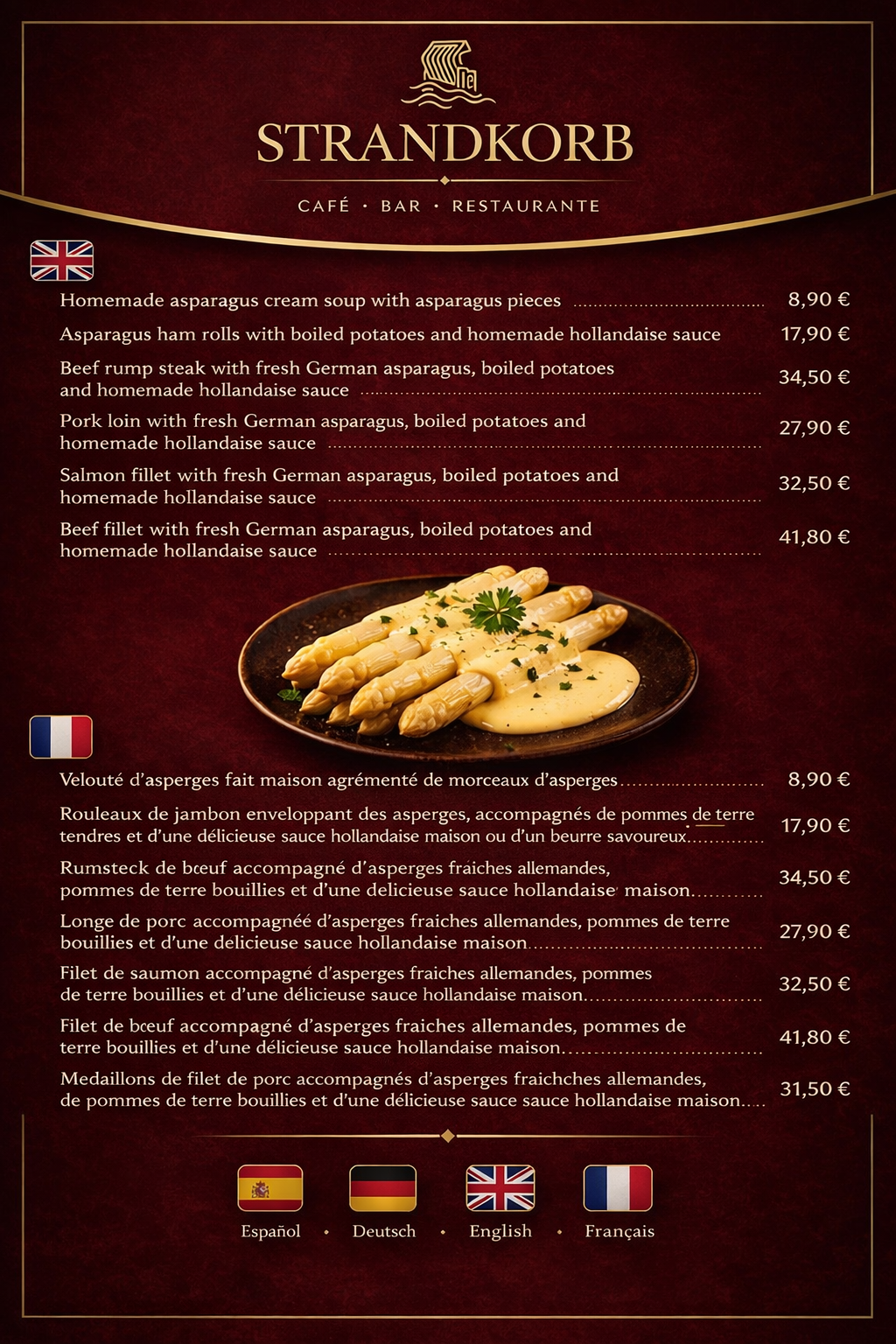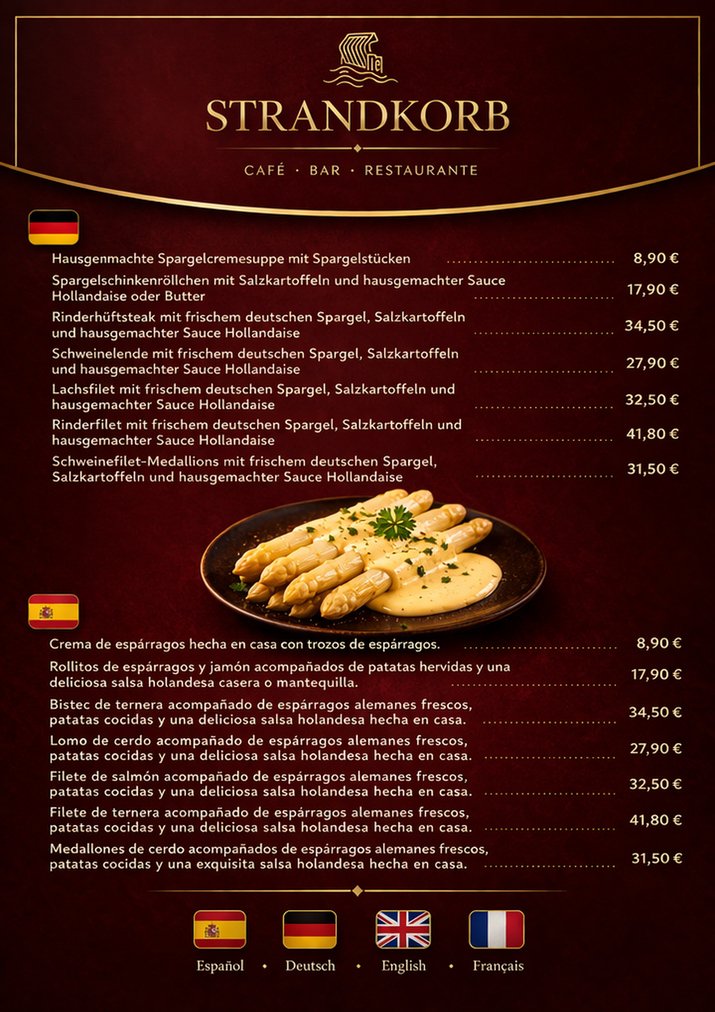 In unserer Zusatzkarte findet ihr eine Auswahl köstlicher Spargelgerichte, die wir im Strandkorb zubereiten.